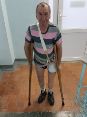 3.Обучение ходьбе на протезе бедра по ровной поверхности с помощью костылей.
